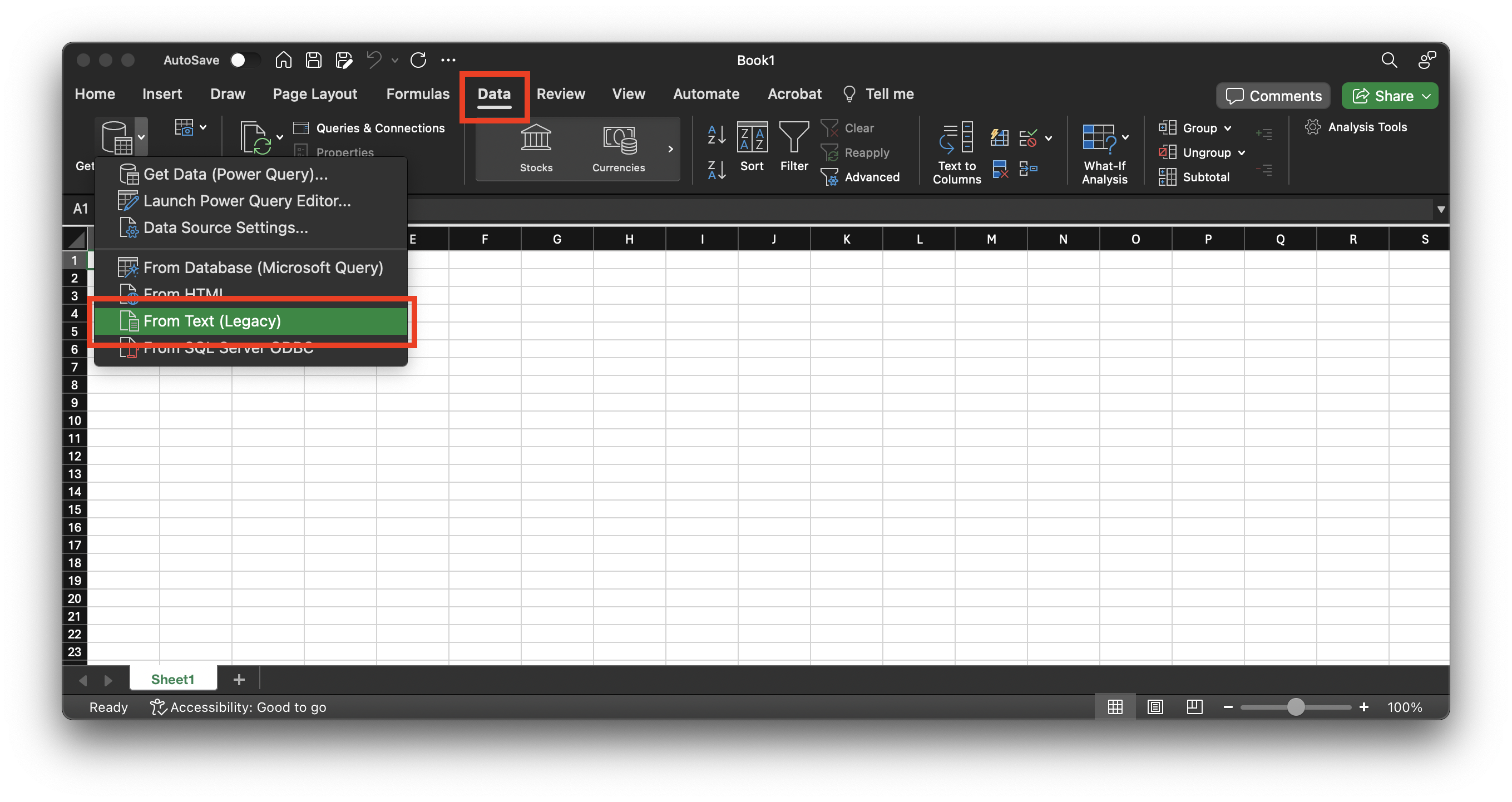 Open a new empty document in Excel, the click on Data -> Get Data -> From Text