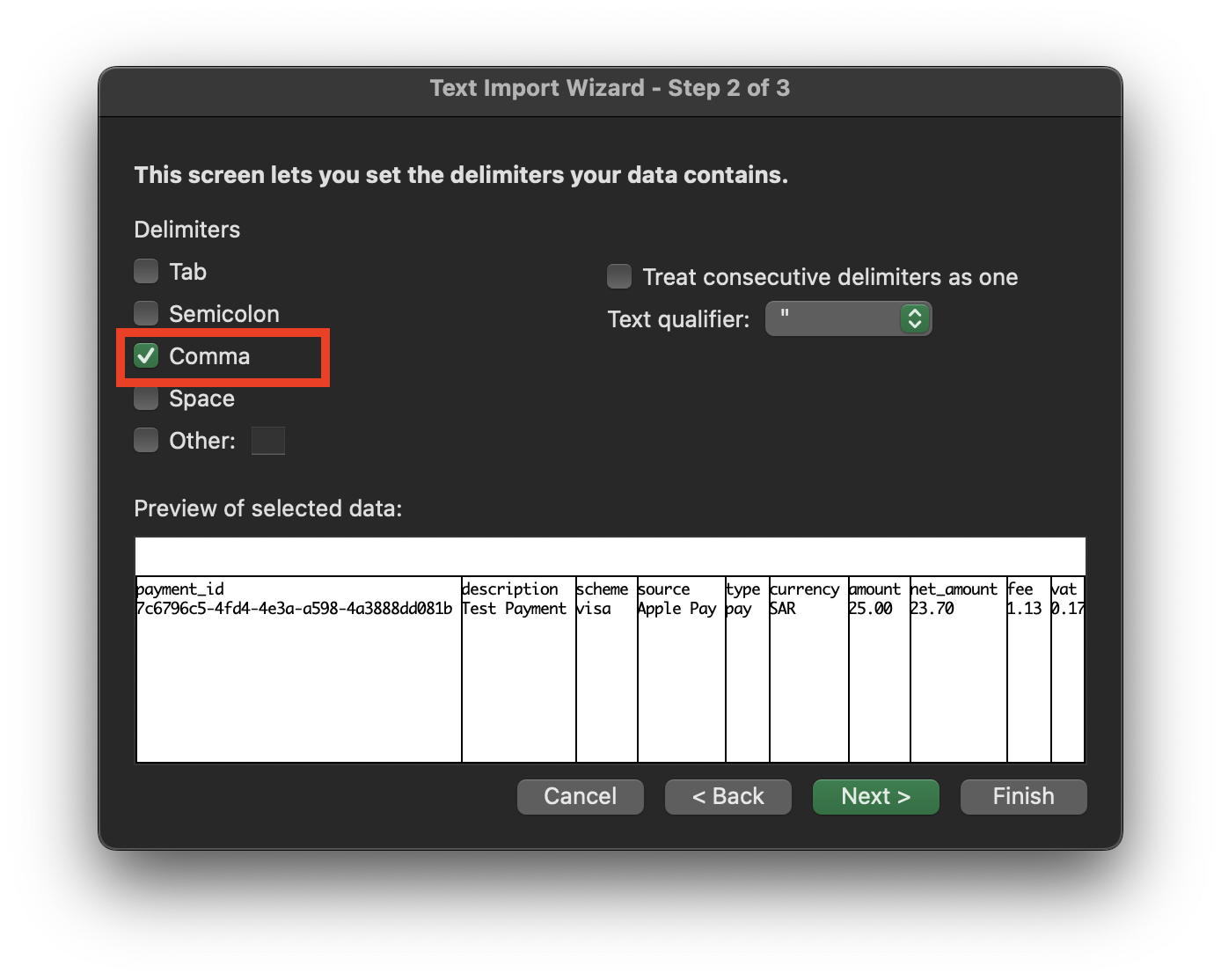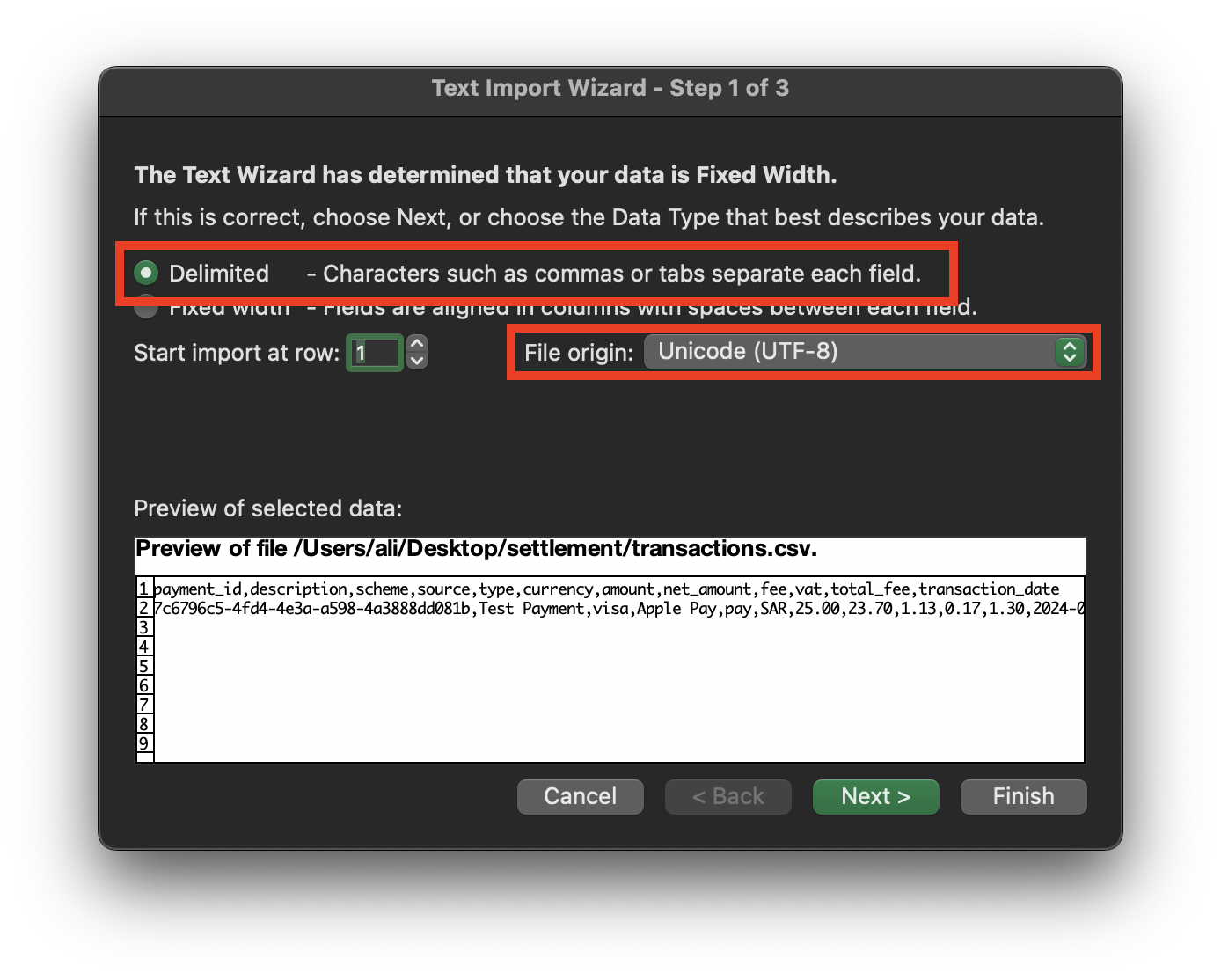 The settlement file provided by Moyasar is a CSV file (Comma Separated Values) encoded using UTF-8.